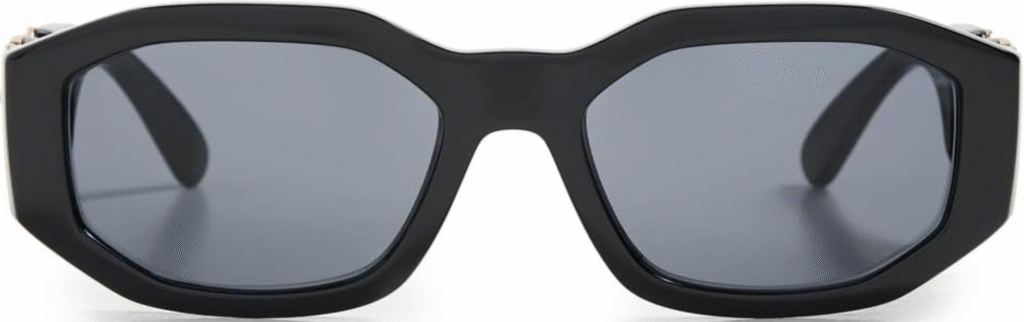 Si tratta di un occhiale caratterizzato da montatura ottagonale in acetato nera, lenti grigio scuro e aste larghe. Il design è tipico dello stile Versace, audace e moderno.