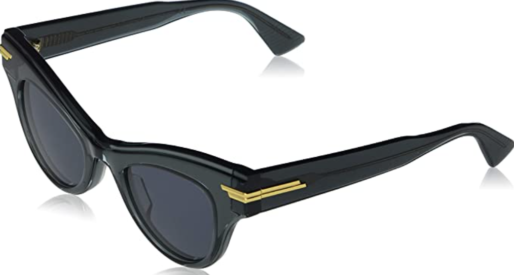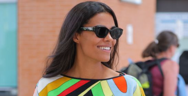 La modella nella foto indossa un abito multicolore dai colori pastello molto bello di Emilio Pucci, abbinato a ballerine nere in vernice. A completare il look di fine estate, Tina Kunakey sceglie di indossare un modello di occhiali da sole Bottega Veneta, BV1004S.